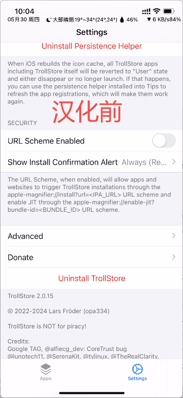 - 如果巨魔商店有新版本提示升级,升级后界面将自动恢复为英文。